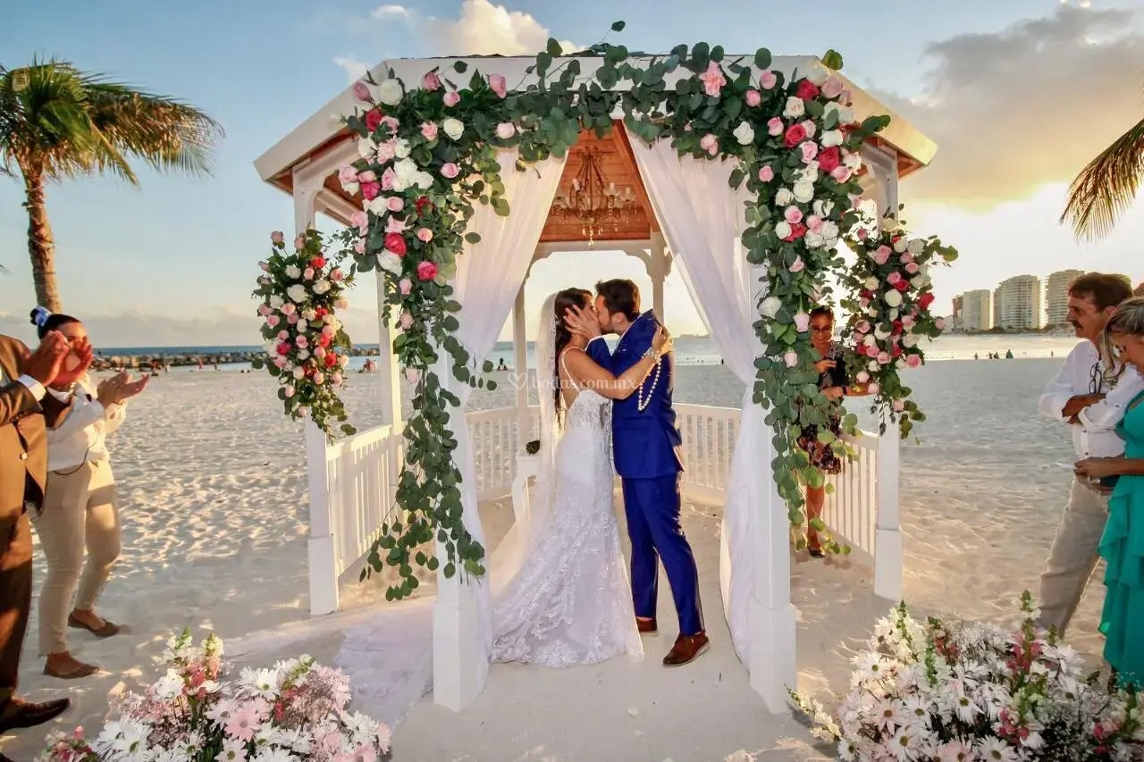 Celebra tu ceremonia en el paradisiaco Krystal Grand Cancún, un escenario digno de postal frente al Caribe Mexicano. Ofrecemos tres espacios únicos: nuestra espectacular playa con piscinas infinity y atardeceres de ensueño, un romántico kiosko junto al mar, o nuestros hermosos jardines tropicales. Con capacidad para grupos íntimos o celebraciones de hasta 120 personas, cada espacio puede personalizarse con opciones de mobiliario elegante, gazebo de bambú con telas blancas y camino de madera. Realizamos una boda por día para garantizar exclusividad y atención personalizada en tu momento especial.